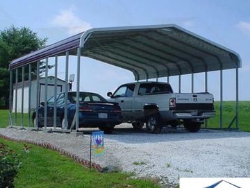 Regular roof style open carport with 7ft side height. 22ft wide generally fits two vehicles comfortably.