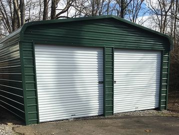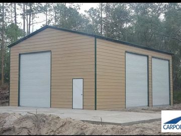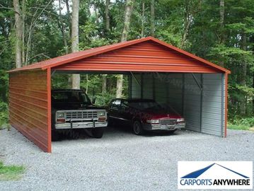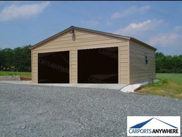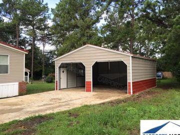 Boxed eave style semi-enclosed carport with 7ft side height. Both sides enclosed and two gable ends (7ft height clearance). 24ft wide is best for two vehicles if you are like my daughter and need extra space when parking.