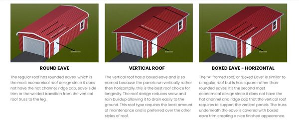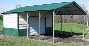 Boxed eave style roof. Fully enclosed with 9ft side height on building and 6ft side height outside edge of lean to. One 8x8 roll up door.
