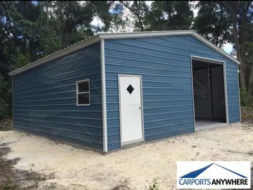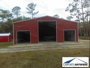 Vertical style roof. Fully enclosed with 14ft side height. One 10x12 roll up door and 36" door on front, two 10x12 roll up doors on sidewall (extra charge for roll up door on sidewall)